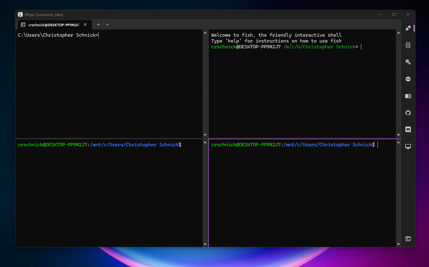 Here is a Windows Terminal instance with 4 split tabs that were launched through the split terminal feature of XPipe 20:
