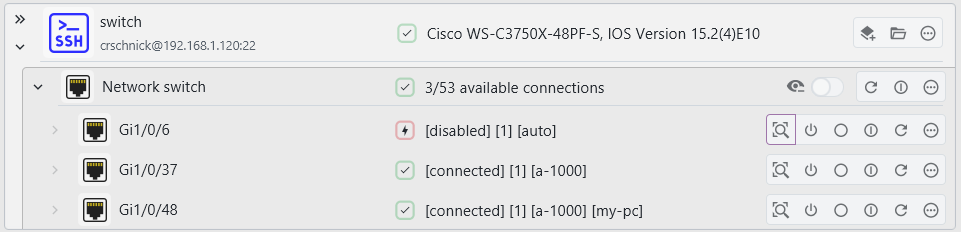 Searching for available connections on a cisco device which was added via SSH should make the network switch ports show up. From the interface you can then: